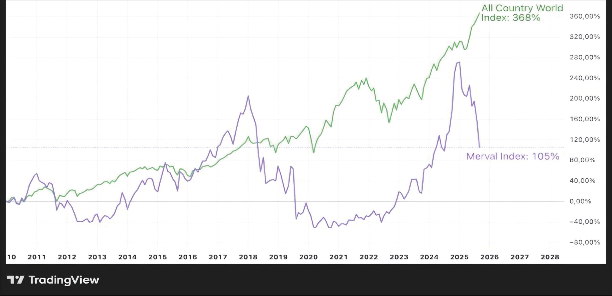 Mientras el Merval se derrumbaba más de 16% el pasado lunes, el MSCI ACWI IMI —
